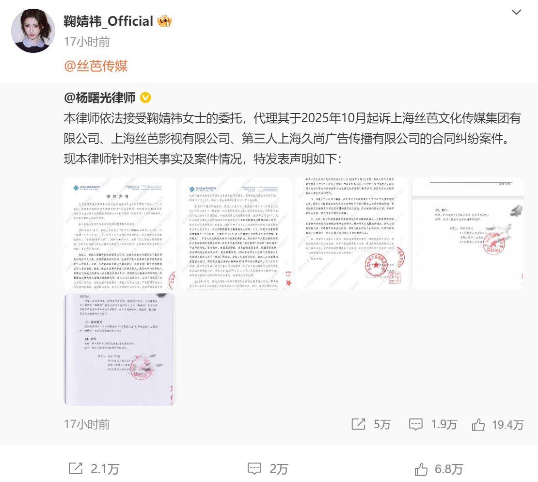 当晚19:12分,鞠婧祎工作室转发了代理律师发布的声明,并艾特了丝芭传媒。声明内容很长,总结来说重点有以下几点: