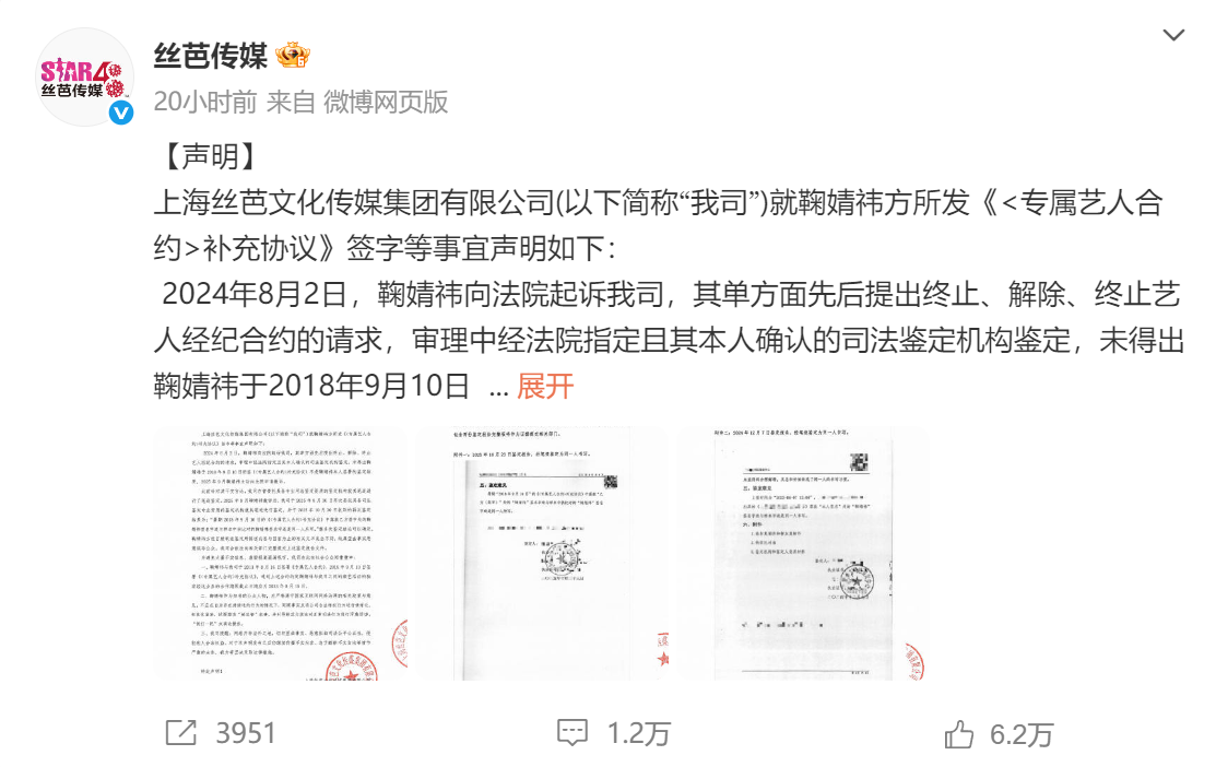 简单来说,丝芭传媒公开了双方官司进展,用鉴定结果证明爽啊发那个在2018年9月10日签署的《专属艺人合约》补充协议中落款鞠婧祎的签名是真实的,以此驳斥鞠婧祎方面否认签名真实性的说法。最后丝芭传媒表示将会提交鉴定报告文件。